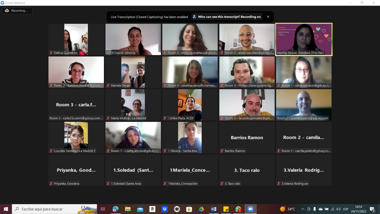 Nos asociamos con la red internacional de voluntariado Goodera y la empresa EYGDS para brindar capacitaciones y encuentros virtuales con 15 voluntarios de esta empresa y abordar temas relacionados a estrategias financieras y de comunicación efectiva interna y externa como ejes claves para el éxito.