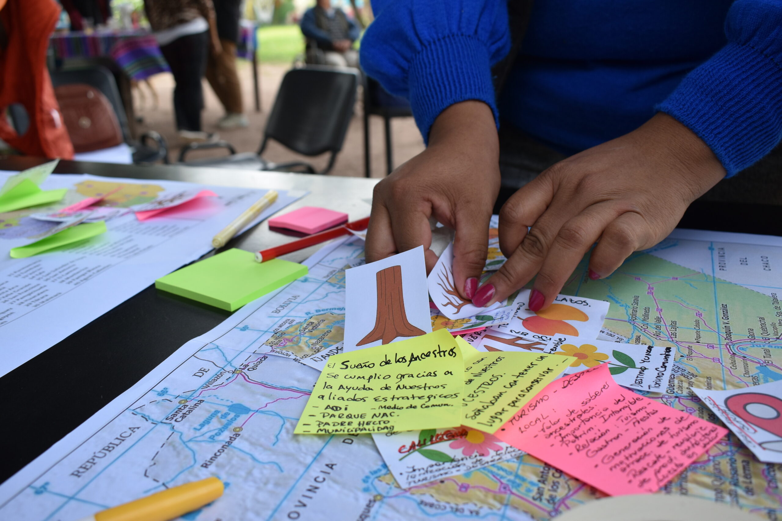 En el encuentro, también se realizó una dinámica de cartografía simbólica, que permitió representar el estado actual del proceso de fortalecimiento del turismo comunitario, sus desafíos y los frutos que se están gestando. A través de raíces, troncos, flores y frutos, se dibujaron también memorias vivas, vínculos y horizontes. Cada símbolo fue un acto de lectura del territorio.