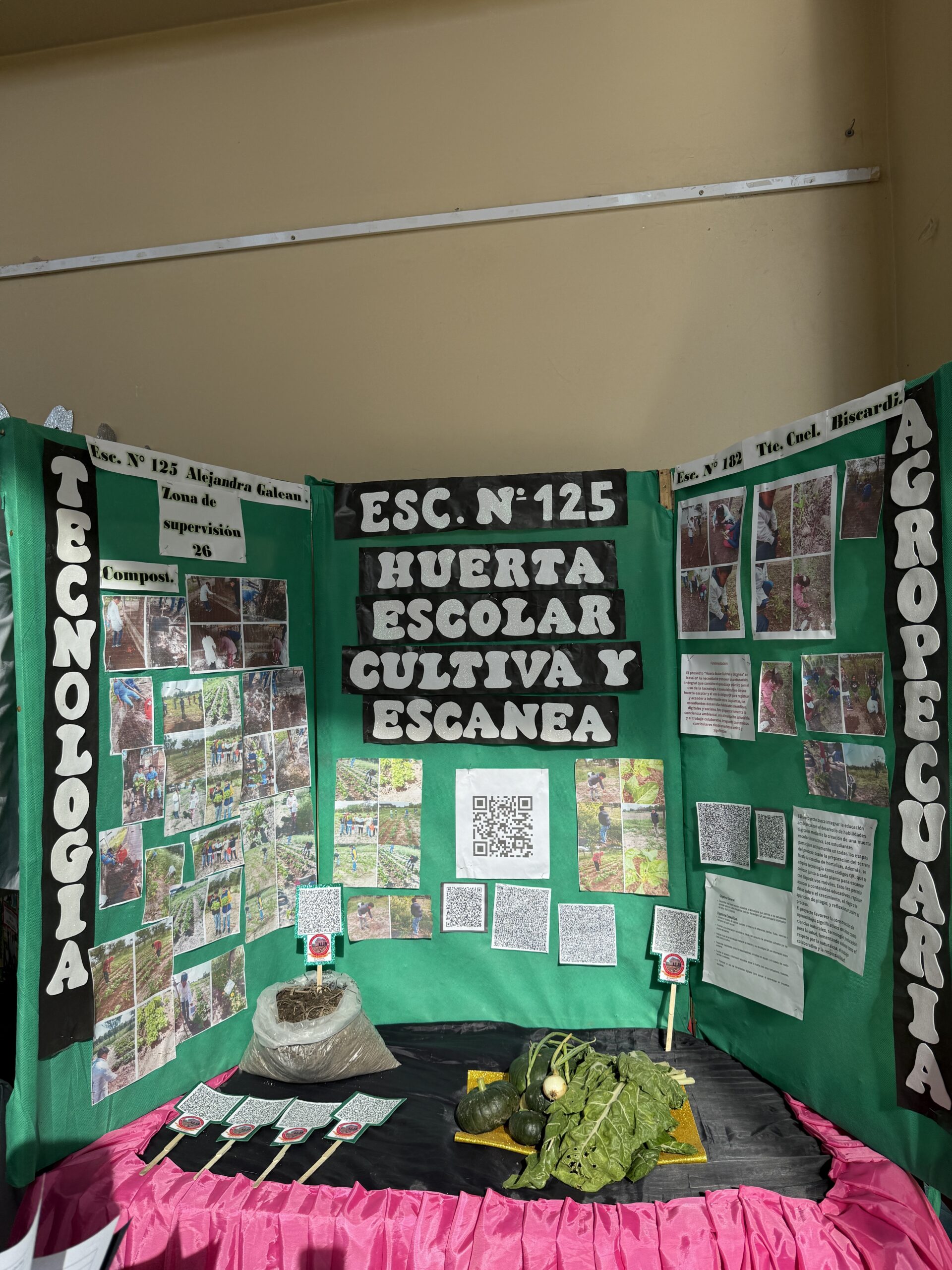 Además, en la entrada del Centro Cultural, las escuelas armaron una pequeña expo verde: maquetas, plantines, almácigos, fotos de sus huertas y hasta un sistema de riego por goteo hecho con material reciclado. Una muestra del enorme talento y creatividad que hay en el territorio.